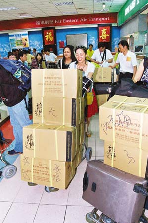 而當(dāng)天下午第一個在松山機(jī)場立榮航空柜臺報(bào)到的南京團(tuán)旅客,行李就超重9公斤,航空公司地勤人員、大陸領(lǐng)隊(duì)及臺灣導(dǎo)游都傻眼。丁海洋表示,希望臺灣方面能夠簡化行李托運(yùn)手續(xù),提供行李托運(yùn)優(yōu)惠。