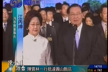剛剛我在電視上看到11點(diǎn)58分,陳會(huì)長、陳夫人踏上臺(tái)灣寶島這塊地上,這一刻,不只是臺(tái)灣的民眾在看、大陸的民眾在看,全世界都在看。因?yàn),這是歷史的一刻,在兩岸交流史上,這一刻整整花了60年;在兩會(huì)成立以來,也是歷史性的一刻,是第一次在臺(tái)北舉行兩會(huì)的會(huì)談;對兩岸關(guān)系的發(fā)展,也是關(guān)鍵的一刻。因?yàn),它是兩岸和平?jīng)濟(jì)雙贏的重要的一步。