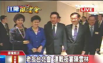 中新網(wǎng)11月4日電 據(jù)臺灣“今日新聞”報道,海協(xié)會會長陳云林4日晚上應(yīng)國民黨榮譽(yù)主席連戰(zhàn)伉儷之邀,與夫人賴曉華赴臺北國賓飯店與政界、企業(yè)界共享晚餐,連戰(zhàn)、陳云林在享用餐點(diǎn)前也先后致詞。