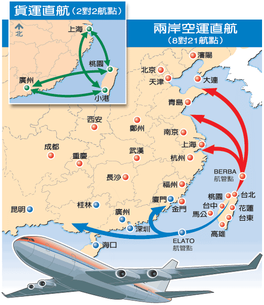 在四項(xiàng)協(xié)議中,最受人矚目的《兩岸空運(yùn)協(xié)議》提到,雙方同意開通臺(tái)灣海峽北線空中雙向直達(dá)航路,建立兩岸航(空)管部門的直接交接程序。雙方同意繼續(xù)磋商開通臺(tái)灣海峽南線空中雙向直達(dá)航路及其它更便捷的航路。