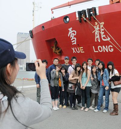 中新網(wǎng)4月4日電 香港大公報(bào)援引聯(lián)合報(bào)三日?qǐng)?bào)道稱,靠泊高雄港的大陸極地科學(xué)考察船“雪龍?zhí)枴比绽^續(xù)讓民眾參觀!把?zhí)枴贝钶d大陸第二十五次南極考察隊(duì)近一百名隊(duì)員,其中有七名女性,來自廈門大學(xué)海洋科學(xué)系碩士班研究生杜金秋有張明星臉,成為隊(duì)員中的“嬌”點(diǎn)。