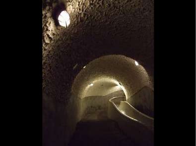 記者當(dāng)日潛入探險的即為西密道。這條看似簡單的密道長180米,高210公分、寬223公分,有86臺階、45個防爆燈,滑梯90米長,還設(shè)有獨立電源、空調(diào)、排水、緊急廣播。建材則是防爆白洋灰、鋼筋水泥。密道坡度很陡,一路走下,就彷佛進(jìn)入了時光隧道,四周昏暗慘白的氛圍,嘿,還真感覺到一些風(fēng)聲鶴唳的緊張氣氛。雖說從建好到現(xiàn)在,密道完全沒有使用過,詭異的是,光滑的溜滑梯上卻留有許多黑色長條刮痕,難道是人沒使用過,卻曾運輸過槍械軍火?
