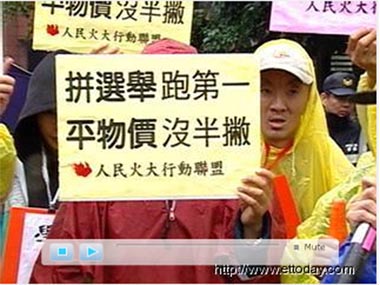 中新網(wǎng)11月6日電 臺(tái)灣民間團(tuán)體“人民火大行動(dòng)聯(lián)盟”6日著帶著蔬果、雞蛋到當(dāng)局“行政院”前抗議。行動(dòng)聯(lián)盟并列舉“高官何不食肉糜 言行錄”,其中陳水扁、呂秀蓮、“行政院副院長(zhǎng)”邱義仁、“行政院經(jīng)建會(huì)”主委何美玥等都榜上有名。