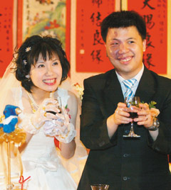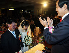 包括蕭萬長(zhǎng)、郝龍斌等政界人士,11日也來現(xiàn)場(chǎng)“沾喜氣”。自稱是“專業(yè)證婚人”的馬英九,擔(dān)任證婚人。經(jīng)驗(yàn)十足的他,證婚不忘宣揚(yáng)政策,要求兩人一定要生足三個(gè);因?yàn)橹灰桥_(tái)北市民生的第三個(gè)孩子,市政府將補(bǔ)助尿布錢。