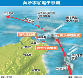 據(jù)臺灣《中國時報》報道,美沙寧號重一萬六千多噸,行經(jīng)臺北縣鼻頭角外海三十三海里處,當時因米塔臺風(fēng)影響,十一級陣風(fēng)掀起巨浪,船艙進水、失去平衡,經(jīng)船長宣布棄船后,約僅五六分鐘即沉沒海中。由于這起船難發(fā)生在素有“臺灣百慕達”之稱的鼻頭角外海,此處海域一向極兇險,過去曾發(fā)生多次海難,使這起船難更顯詭異。