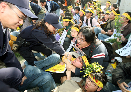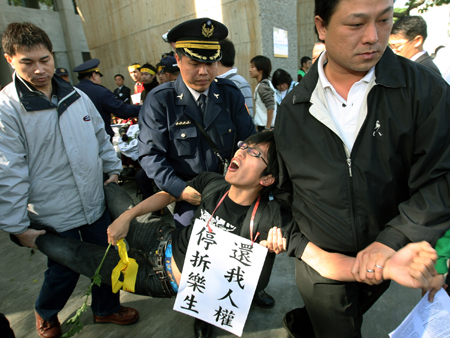 據(jù)臺(tái)灣媒體報(bào)道,抗議者每人手持一枝菊花,并高舉訴求布條,在園區(qū)門(mén)前集結(jié)訴求“反迫遷,定古跡”。隨后警方強(qiáng)制驅(qū)離靜坐人士,共有約四十名靜坐者與一名樂(lè)生院民被帶往警局。