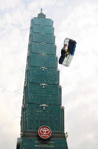 據(jù)臺(tái)灣《中華日?qǐng)?bào)》報(bào)道,38歲的奧地利定點(diǎn)跳傘者Felix Baumgartner(中文譯為彭剛納爾)于11日在未經(jīng)一O一大樓許可情況下,從508米高的臺(tái)北一O一高樓的一露天觀景臺(tái)縱身跳傘。