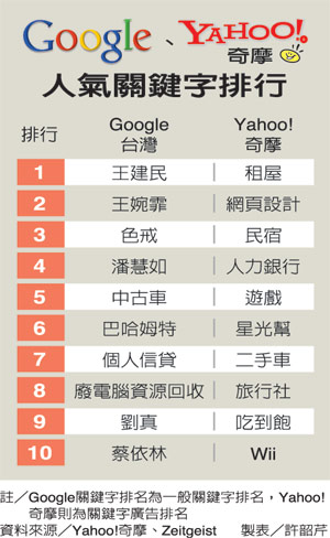 而另一大網(wǎng)絡(luò)搜尋引擎Google發(fā)布的11月臺(tái)灣網(wǎng)友一般關(guān)鍵詞廣告排行榜,前十名幾乎都是王建民、王婉霏、色戒、潘慧如、蔡依林等影視、體育話題人物。不過“中古車”也名列第五名,可見民眾對于中古車興趣濃厚。