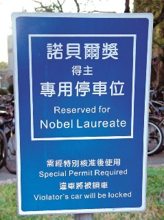 這個(gè)專屬停車位,位在臺(tái)大小椰林大學(xué)旁的“中研院”原分所后方。停車位旁還樹立了一個(gè)醒目的標(biāo)示牌,藍(lán)底白字用中英文寫著“諾貝爾獎(jiǎng)得主專用停車位”,上頭還注明“需經(jīng)特別核準(zhǔn)后使用,違車將被鎖車”。