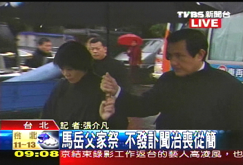 中新網(wǎng)2月3日電 國(guó)民黨2008參選人馬英九的岳父日前去世。今天(3日)舉辦公祭,馬英九家人一大早就出門(mén)前往殯儀館。家祭的最后,馬英九跪在老丈人遺體面前,感性地表示自從和周美青結(jié)婚后,讓周美青相當(dāng)委屈,也感謝老丈人多年來(lái)在背后的支持。