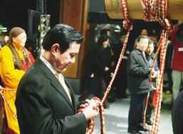 中新網(wǎng)2月9日電 綜合臺灣媒體報道,國民黨“大選”候選人馬英九在年除夕到法鼓山撞鐘,沒想到繩子竟然應(yīng)聲而斷,讓他非常尷尬,幸好搭檔蕭萬長趕緊解圍,把自己的繩子分了一半給馬英九拿。有人解讀這是觸霉運,不過馬英九自己的解讀是,他是在幫臺灣把厄運甩掉。