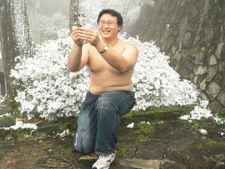據(jù)臺灣《聯(lián)合報》報道,周漢勛是成大四年級學(xué)生,和朋友從合歡山一路玩到太平山,看到情侶們雙雙對對在雪中散步,十分羨慕;當(dāng)場脫光上衣,跪在雪地上,手拿一把“雪花”,請記者為他傳情,向暗戀已久的學(xué)姐告白,“我喜歡你很久了,只想告訴妳,我喜歡你,我們在一起吧!”