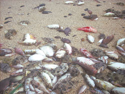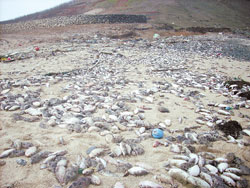 全鄉(xiāng)只有四千余人的望安,是由十八個(gè)島嶼組成,但除了望安本島外,其它都是無人島。洪嬡慧說,從春節(jié)以后望安的海灘上就開始出現(xiàn)死魚,最初還有不少民眾撿拾,專挑大尾的或還有口氣的,有些人一天可撿一百多公斤;但這兩天海灘上的魚都死了,已不再有民眾撿拾,因此是遍地魚尸,讓人寸步難行,只能用慘不忍睹形容。