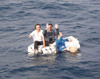 他把三個(gè)碰墊綁在一起,讓大陸漁工坐在碰墊上,他抱著碰墊取得平衡,自己下半身泡在海水里。徐東誠(chéng)說(shuō),當(dāng)時(shí)海上一片漆黑,三個(gè)人抱著浮力碰墊載浮載沉,力氣用盡。期間,直升機(jī)飛過(guò)頭上幾次都沒(méi)發(fā)現(xiàn)他們。