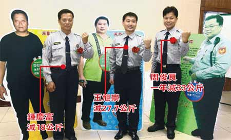專業(yè)警察單位第1名的鐵路警察局警員鐘慶富利用飲食控制跟慢跑快走,3個月內成功減下18公斤。女警方面,花蓮縣警察局督察室督察員連錦秀05年產(chǎn)后胖了30公斤,利用中午游泳及騎自行車,成功減下30公斤,都是減重成功的最佳范例。