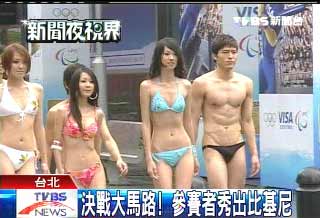 中新網(wǎng)4月29日電 據(jù)臺灣TVBS報(bào)道,臺北東區(qū)街頭28日下午出現(xiàn)清涼秀,電視比賽節(jié)目“決戰(zhàn)第一名”22名參賽者,把舞臺搬到大馬路上,直接把班馬線當(dāng)伸展臺走,參賽者身上只穿單薄比基尼走秀,路旁的行人則干脆拿手機(jī)拼命拍。