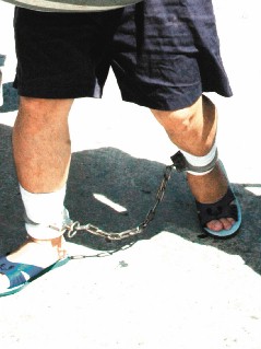 據(jù)稱,綠島監(jiān)獄規(guī)定所有新收受刑人從入獄當(dāng)天起得戴腳鐐?cè)齻(gè)月,表現(xiàn)好才解除,因腳鐐皆生銹,常有受刑人的腳磨破,細(xì)菌感染得到蜂窩性組織炎,腿腫得跟象腿一般,申請(qǐng)到臺(tái)灣就醫(yī),機(jī)票及醫(yī)藥費(fèi)還得自付。
