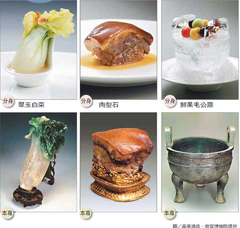 據臺灣聯(lián)合報報道,菜色內容與“故宮”文物緊密結合的“國寶菜”,試做菜色就約花了兩個多月。主廚蕭廣安表示,每道“國寶菜”都有相當難度。為了讓菜與文物達到“近乎相同”的境界,“型與味”皆一再調整,直到昨天才完全拍板定案。