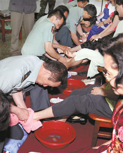 今年五月時(shí),六軍團(tuán)更藉舉辦模范母親表揚(yáng)典禮,發(fā)起一項(xiàng)為母洗腳的活動(dòng),其中六軍團(tuán)政戰(zhàn)主任曾有福少將,因?yàn)槟赣H也當(dāng)選單位模范母親,雖然身著軍服肩上掛著一顆星,但同樣上臺(tái)跪地為母洗腳,讓母親相當(dāng)感動(dòng),當(dāng)場(chǎng)自己也淚流滿面。