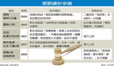 “襲胸十秒無(wú)罪事件”,發(fā)生在05年11月,彰化員林內(nèi)衣特賣會(huì)上發(fā)生女子遭摸胸的事件,檢方依強(qiáng)制猥褻罪起訴后,彰化地院以10秒鐘無(wú)法引起加害人性欲為由,判定無(wú)罪。