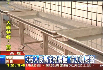 不只是尸盤被偷,歹徒連火葬場的檢尸盤也不放過。殯儀館方面說,因為殯儀館幅員廣大,沒有圍墻,入夜之后只有4個人留守,人力根本不夠,才會遭竊。