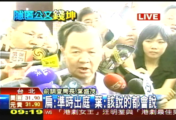 中新網(wǎng)9月5日電 前臺(tái)灣“調(diào)查局長(zhǎng)”葉盛茂在今天(5日)上午9點(diǎn)15分左右抵達(dá)臺(tái)北地檢署,出席9點(diǎn)半召開的偵查庭。葉盛茂在抵達(dá)時(shí)透過(guò)媒體喊話表示:“我今天會(huì)坦然面對(duì)、具體陳述,也會(huì)充分配合!