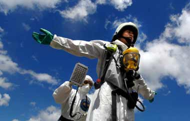 演習(xí)中舉行輻射彈爆炸處置,身著防護(hù)衣的臺(tái)軍部隊(duì)進(jìn)行輻射偵測(cè)