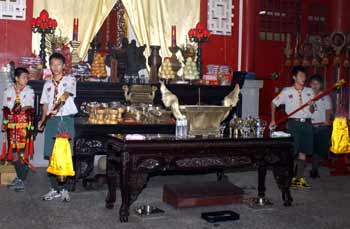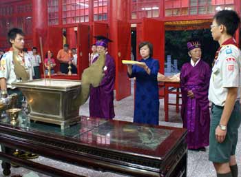 中新網(wǎng)9月28日電 08年嘉義市各界紀念大成至圣先師誕辰釋奠典禮今天上午如期在嘉義公園內(nèi)孔廟舉行。因薔薇臺風(fēng)來襲,顧及學(xué)生安全,今年首度取消佾舞,并創(chuàng)下由童軍擔任禮生的先例。不少民眾和小朋友冒著風(fēng)雨到場觀禮,并在祀典后領(lǐng)取智能糕,期能增長智能、學(xué)業(yè)進步。