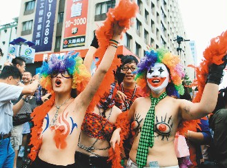 鼓吹素食主義的“素食男兒”,打出“給我男體,不要尸體”口號(hào),連推車都是回收紙箱制成,環(huán)保做得很徹底;二度上街的“Bi the Way”標(biāo)語(yǔ)“我們是雙性戀”寫(xiě)得斗大,姿態(tài)比去年更突出;壓軸的男同性戀游泳隊(duì)“水男孩”也依然廣獲喝采掌聲。