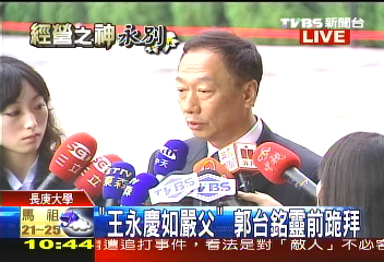 據(jù)臺灣TVBS報(bào)道,郭臺銘說:“他是除我父親以外第一個(gè)跪拜的人,因?yàn)槲矣X得他的精神,他對我的照顧,他給我的啟發(fā),他不但是臺灣工業(yè)之父,在我心目中,就像一個(gè)嚴(yán)父、慈父一樣,所以我覺得我不能表達(dá)什么,但是我一點(diǎn)點(diǎn)小小的心意,能夠讓我對他有所的追思,有所的惋惜!