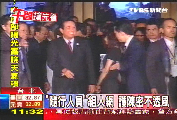 抵達(dá)圓山,陳云林忙著打招呼,這2名貼身隨行人員全程睜大眼掌握情況,維護(hù)現(xiàn)場(chǎng)秩序,與臺(tái)灣方面派出的維安人員,變換隊(duì)伍化成同心圓,層層戒護(hù)。