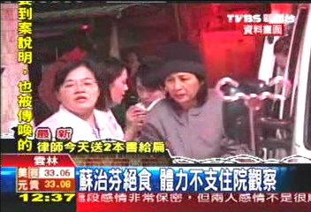 民進黨籍云林縣長蘇治芬獄中絕食,已超過250個小時沒有吃東西,體力不支,兩度被送到醫(yī)院觀察。圖片來源:臺灣TVBS