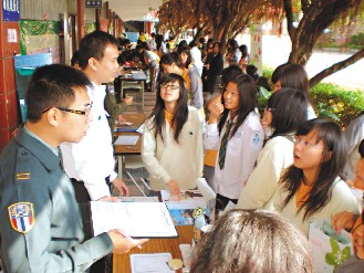 現(xiàn)場以臺軍北區(qū)人才招募中心的攤位人氣最旺,被許多學(xué)生包圍詢問待遇和發(fā)展,并留下個人資料;一名軍官表示,高職畢業(yè)生報(bào)考志愿役士兵及儲備士官,畢業(yè)起薪新臺幣2萬7000元,報(bào)考士官二專班以3萬4000元起薪。