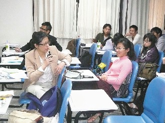 臺灣靜宜大傳系助理教授陳明媚(左)在“色情片分析“課堂上,與學(xué)生溝通,內(nèi)容直接露骨。圖片來源:臺灣《聯(lián)合報(bào)》