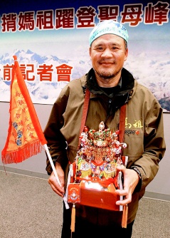 中新網(wǎng)3月17日電 據(jù)臺灣《聯(lián)合報》報道,臺灣登山好手李小石計劃背負馬祖天后宮媽祖金身攀登世界最高峰珠穆朗瑪峰,16日出發(fā),連江縣長與上百鄉(xiāng)親到桃園機場送媽祖啟程,為李小石加油打氣。
