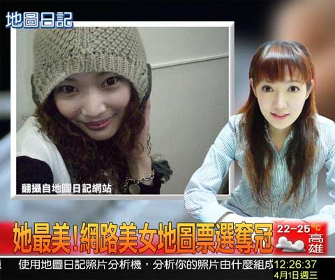 “想知道誰是臺灣最美的女性嗎?地圖日記網站日前舉辦美女票選,活動一個月就突破千萬的瀏覽率…”,玄藏大學大三生劉伊珊一周前上傳自拍照片,制成網絡美女票選奪冠的頭條新聞,沒想到還成功騙倒兩個同學。劉伊珊說,當初只是想給同學一個驚喜,竟還有同學看到之后問,“你真的上電視喔?”