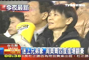中新網(wǎng)4月3日電 據(jù)臺(tái)灣TVBS報(bào)道,馬英九夫人周美青最近迷上臺(tái)灣職業(yè)棒球,只要有她支持的兄弟象隊(duì)出賽,她都一定到場(chǎng)加油,但終場(chǎng)兄弟象還是輸了比賽,讓周美青好失望。