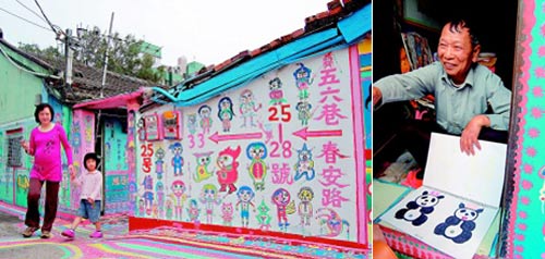 中新網(wǎng)4月7日電 據(jù)臺(tái)灣《聯(lián)合報(bào)》報(bào)道,臺(tái)中市有處五彩繽紛的彩繪眷村,墻面、地板畫滿人像、動(dòng)物與色塊,夢境般場景吸引大批博客、攝影玩家,孤寂的眷村頓時(shí)熱鬧起來;這些圖畫都出自86歲退伍老兵黃永阜之手,他說,畫圖是排遣無聊,沒想到大家喜歡,讓他越畫越起勁。