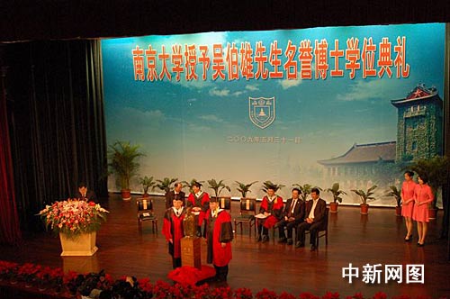 中新社南京五月三十一日電 (記者 陳光明 朱曉穎)南京大學授予中國國民黨主席吳伯雄法學名譽博士學位典禮今天上午在南大小禮堂舉行。