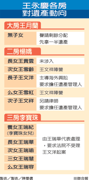 依王文洋說(shuō)法,王永慶光是在美國(guó)就有超過(guò)新臺(tái)幣二千六百億元的海外信托基金;最近媒體又曝光王永慶的大陸資產(chǎn),據(jù)說(shuō)光是在大陸的石化廠、電廠等就值五千億元臺(tái)幣。換句話說(shuō),王永慶的二房認(rèn)為,王永慶在海外至少有七、八千億元遺產(chǎn)下落不明。