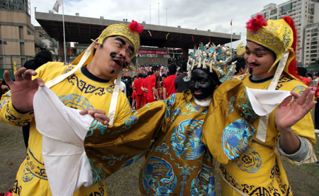 據(jù)“中央社”報道,表演藝術(shù)研究所師生穿上傳統(tǒng)服飾,演出媽祖出巡祈福劇目。其中,飾演“黑面媽祖”與護駕的三位同學更以“俏皮”扮相博得喝彩。(黃自強)