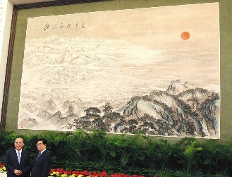 中新網(wǎng)5月29日電 中共中央總書(shū)記胡錦濤28日在北京人民大會(huì)堂會(huì)見(jiàn)中國(guó)國(guó)民黨主席吳伯雄一行。臺(tái)灣媒體注意到,雙方在“江山如此多嬌”巨幅畫(huà)前合影留念,蘊(yùn)含深意。