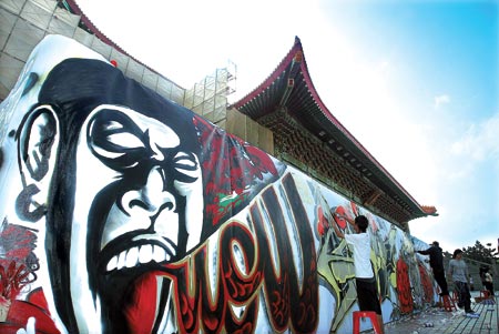 中新網(wǎng)10月22日電 據(jù)臺灣《中國時報》報道,昨日天氣晴朗,民眾紛紛外出走動,臺北“中正紀念堂”內(nèi)雖然有兩廳院屋宇修復工程,卻也舉行快樂涂鴉活動,邀請涂鴉高手在圍籬上一展身手,為修繕中的兩廳院增添了不同的面貌。
