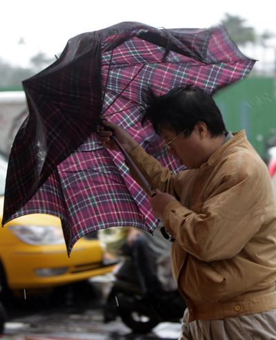 米塔臺風(fēng)二十六日下午已轉(zhuǎn)為輕度臺風(fēng),臺灣氣象部門預(yù)測米塔臺風(fēng)暴風(fēng)圈將會縮小,但外圍環(huán)流與鋒面共伴效應(yīng)為臺灣島北部及東部帶來的豪雨仍會持續(xù)。圖為行人在雨中艱難行進!爸醒肷纭眻D 張皓安 攝