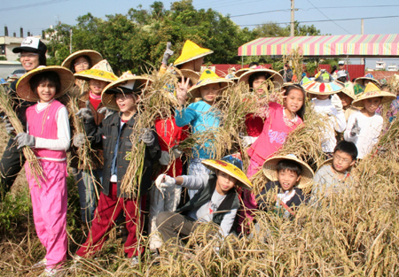 臺灣省南投縣草屯鎮(zhèn)炎峰小學(xué)四年級學(xué)生日前體驗水稻插秧,經(jīng)過一期的水稻長成,小小農(nóng)夫三十日下田收割,體驗農(nóng)民收割稻谷的辛苦與歡欣。“中央社”圖 曾立 攝
