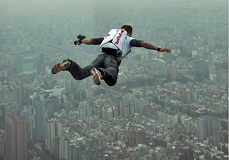 奧地利極限玩家Felix Baumgartner挑戰(zhàn)高樓跳傘,十一日在臺北一○一大樓頂樓一躍而下,完成自世界最高樓跳傘的任務(wù)。Baumgartner自三年前一○一大樓完工后便躍躍欲試,經(jīng)過兩次實地勘查之后,于十一日下午四點十八分自高樓跳下,經(jīng)過五秒鐘自由落體后成功打開降落傘安全降落。《中國時報》圖