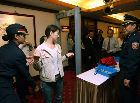 臺(tái)灣當(dāng)局“國(guó)安”單位近來(lái)加強(qiáng)安全工作。圖為陳水扁十三日出席公開活動(dòng)時(shí),出席人員連外套都須脫下檢查!爸醒肷纭眻D 郭日曉 攝