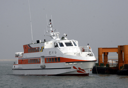 一百八十二人座“仙洲號(hào)”交通船已經(jīng)駛抵金門,將于明年初投入大小金門海上輸運(yùn)行列!爸醒肷纭眻D 倪國(guó)炎 攝
