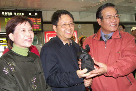 泉州天后宮澎湖參訪團成員林林(中)二十八日抵澎湖馬公機場,是“小三通”第一千名訪澎的大陸旅客。圖為澎湖縣長王干發(fā)(右)致贈紀念品,左為澎湖縣議會議長劉陳昭玲。“中央社”圖 高茂雄 攝