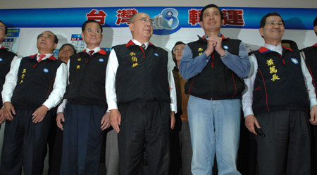 國(guó)民黨在十二日“立委”選舉中大勝,國(guó)民黨中央黨部晚間舉行記者會(huì),黨主席吳伯雄表示不敢懈怠,高興只要一晚就好,接下來(lái)還有“大選”要拼。國(guó)民黨“大選”參選人馬英九則拱手感謝民眾支持!爸醒肷纭眻D 王飛華 攝